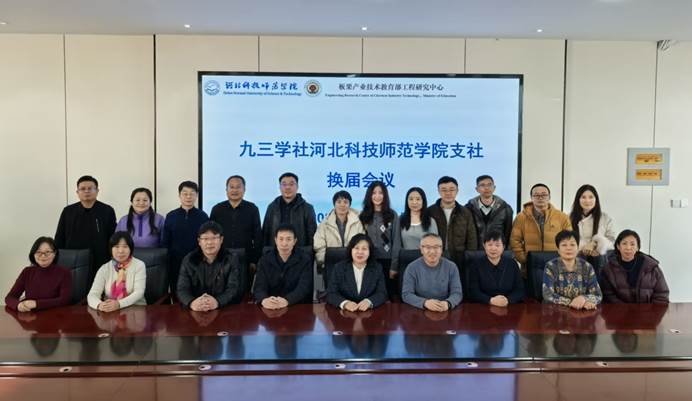 2025年12月23日,九三学社河北科技师范学院支社换届会议在秦皇岛校区举行。九三学社秦皇岛市委专职副主委周雪娇主持会议,三级调研员邢克余、社市委宣传部长张海涛,校党委统战部长王荣加到会并讲话。学院支社主委闫立英等18名社员参会。