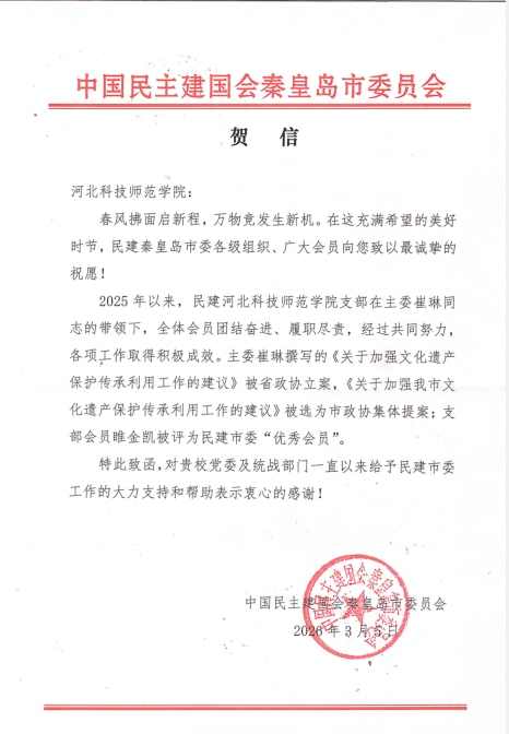 近日,中国民主建国会秦皇岛市委员会向我校发来贺信,对民建河北科技师范学院支部2025年以来的工作成效表示祝贺,同时感谢我校党委及统战部门对民建工作的大力支持。